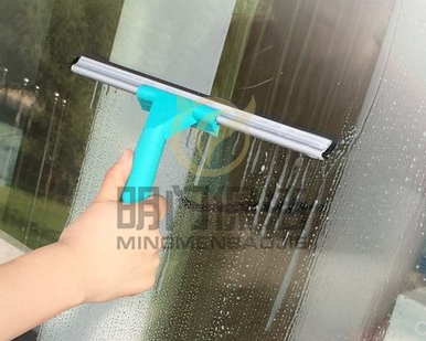 3.用玻璃刮刮去玻璃上的水分,玻璃刮和玻璃平面应保持一定的角度;当玻璃的位置和地面较接近时,应把毛头或玻璃刮作横向移动;