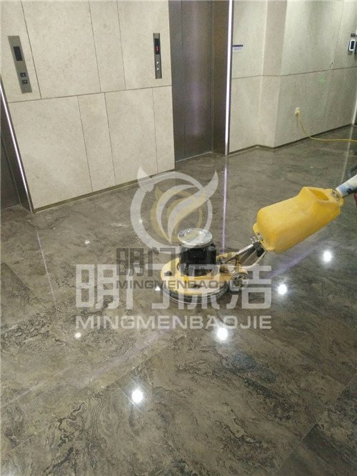 4.打磨完成后将地面清理干净,开始作精硬处理,先将精硬粉剂适量洒于地面上,再洒上喷   剂,用天然纤维垫以翻新机抛磨至混合干涸状态,如果纤维上积满干硬的混合剂时,就必须另外换一块(每次精硬处理3-4平方米),直到抛磨完成后再 换上干净的不锈钢丝棉垫,喷上少量喷剂,重新全面的抛磨一次。抛磨完后用地拖拖净地面残留粉剂,石面应立即呈现出坚硬光亮表层。