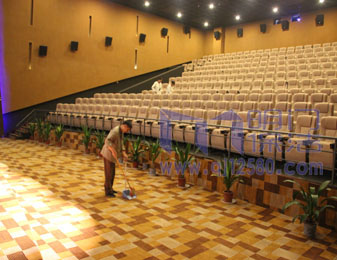 我司明门保洁为重庆解放碑英利国际购物中心八楼的重庆万众英利电影院,提供电影院保洁外包托管服务。 电影院保洁外包托管服务中正在打扫清洁的员工 电影院保洁外包托管服务中