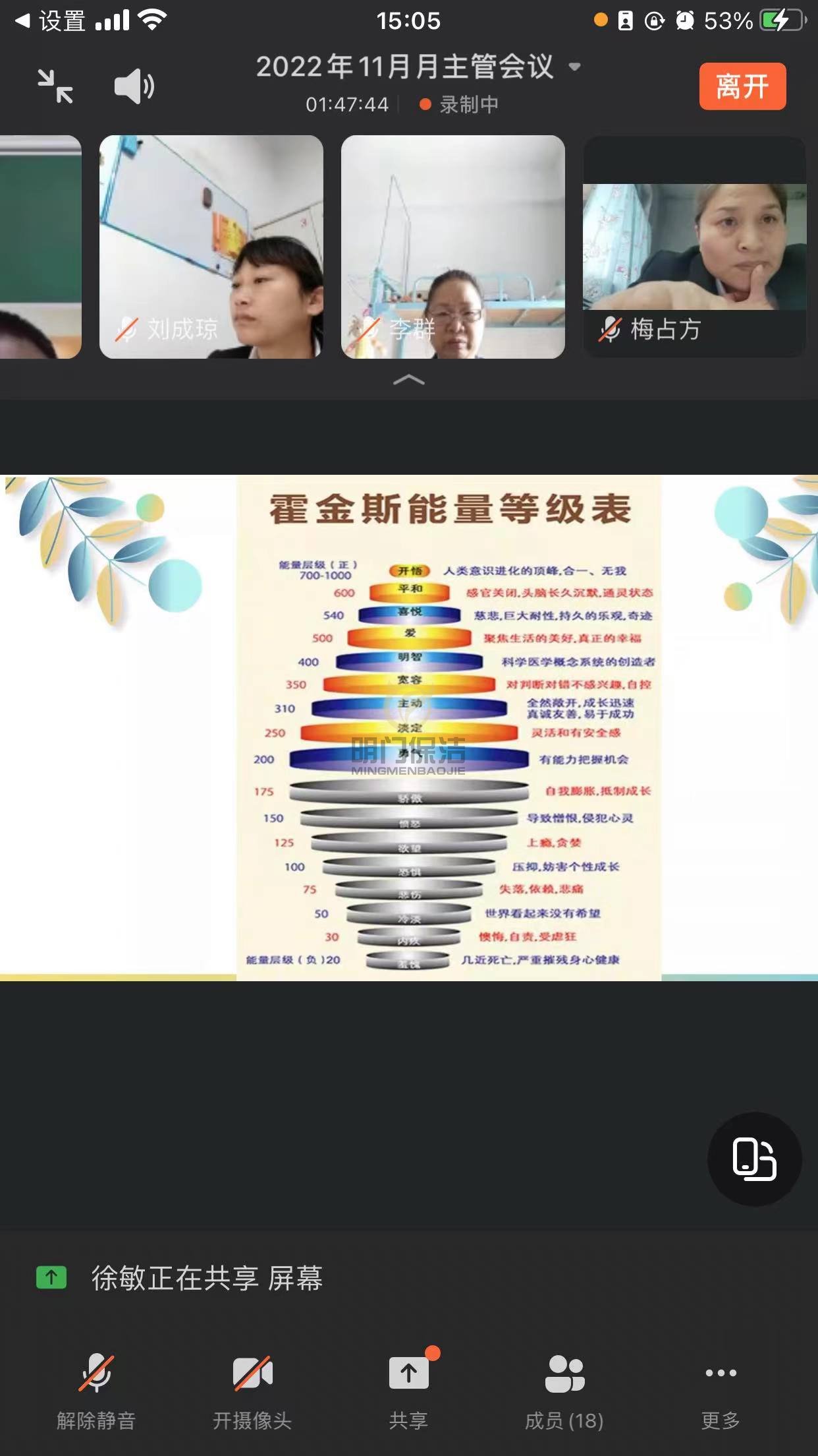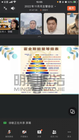 11月份的主管会议因疫情原因,我们首次主管会议改为线上会议。主要由公司余总讲解《生命状态的提升》培训。在这个疫情的大环境下,让我们怎么调解心态,让我们每天都正能量满满的面对生活和工作。