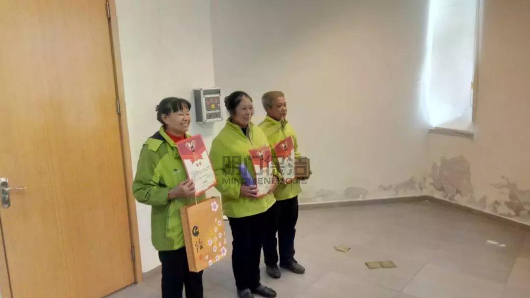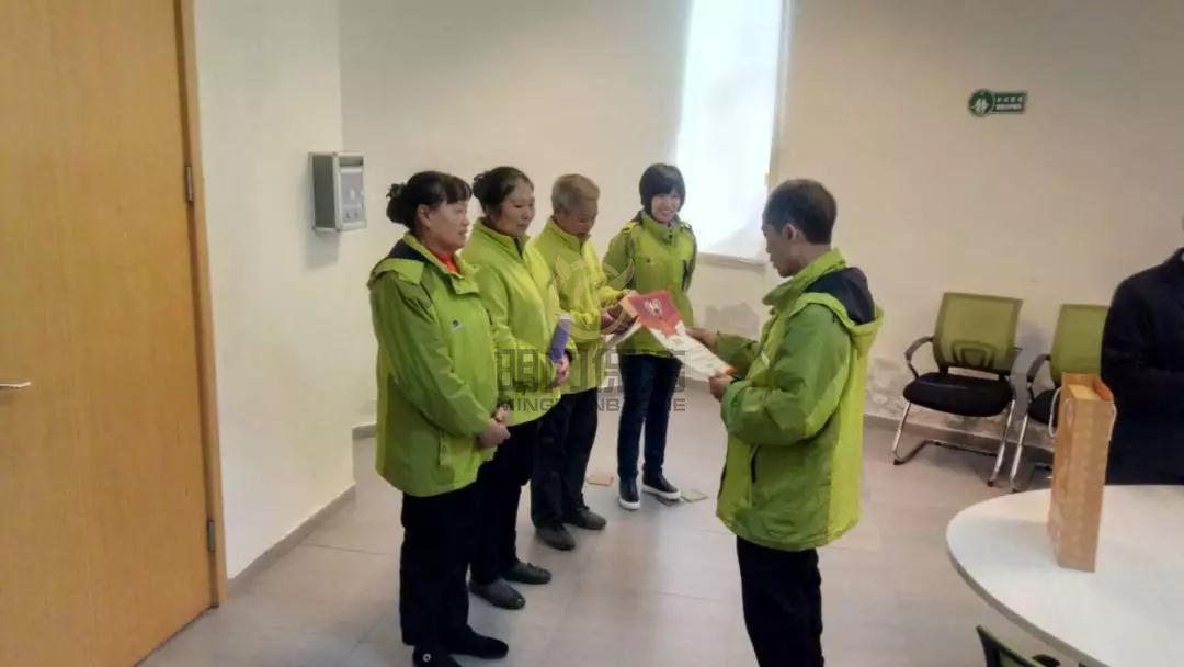 礼品虽小但是意义非凡,看到阿姨们脸上的笑容,就会感觉特别的温暖,台上的就是本次品牌分表现优异的阿姨了。大家站在一起合影,就像一个大家庭一样,上下齐心,不分你我,一起把心景场地的保洁质量做好。