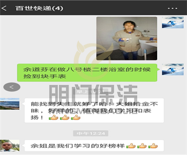 2019年3月6日,明门保洁百世快递场地的余道芬阿姨在做八号楼二楼浴室的时候捡到一块手表,及时上交给该场地负责人,积极寻找失主,阿姨看到手表没有一丝一毫私心,而是心系失主,这种行为是大家学习的楷模。
