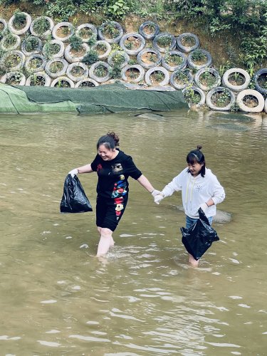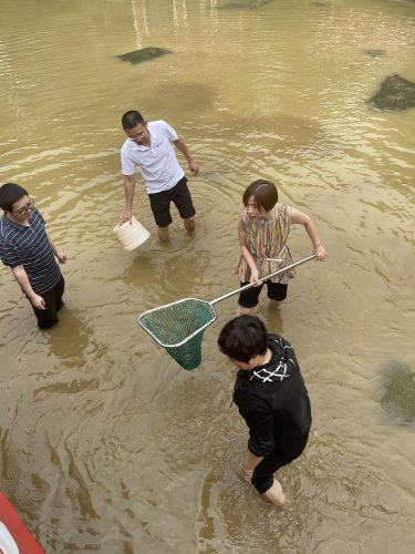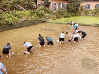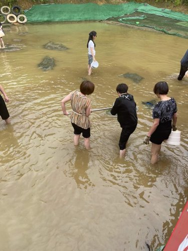 在池塘里,大家好些个来回的赶鱼,不论是用桶扑还是袋子捞,只见鱼儿就在眼前晃,就在腿边蹭,却抓不到它,大家的体力已消耗不少,但是兴致却没有下降。