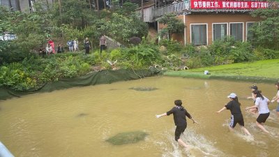为了抓住鸭子,邱主管奋不顾身地扑向鸭子,即使全身湿透,也毫不在意。