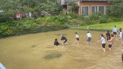 徒手抓鱼,难度太大,最后把捞鱼的网用上,才顺利捞不少鱼。