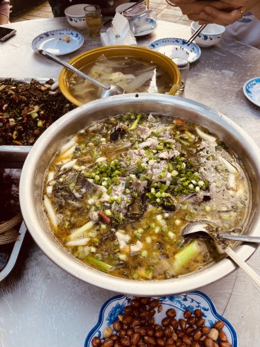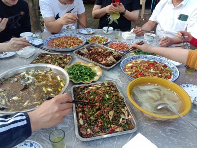 5点,大家的体力消耗差不多了,收拾好战利品和行囊,我们驾车来到了太极山庄,大家吃到了这里的特色美食——藤椒鸡。 还有我们在池塘抓的鱼,也上桌了!