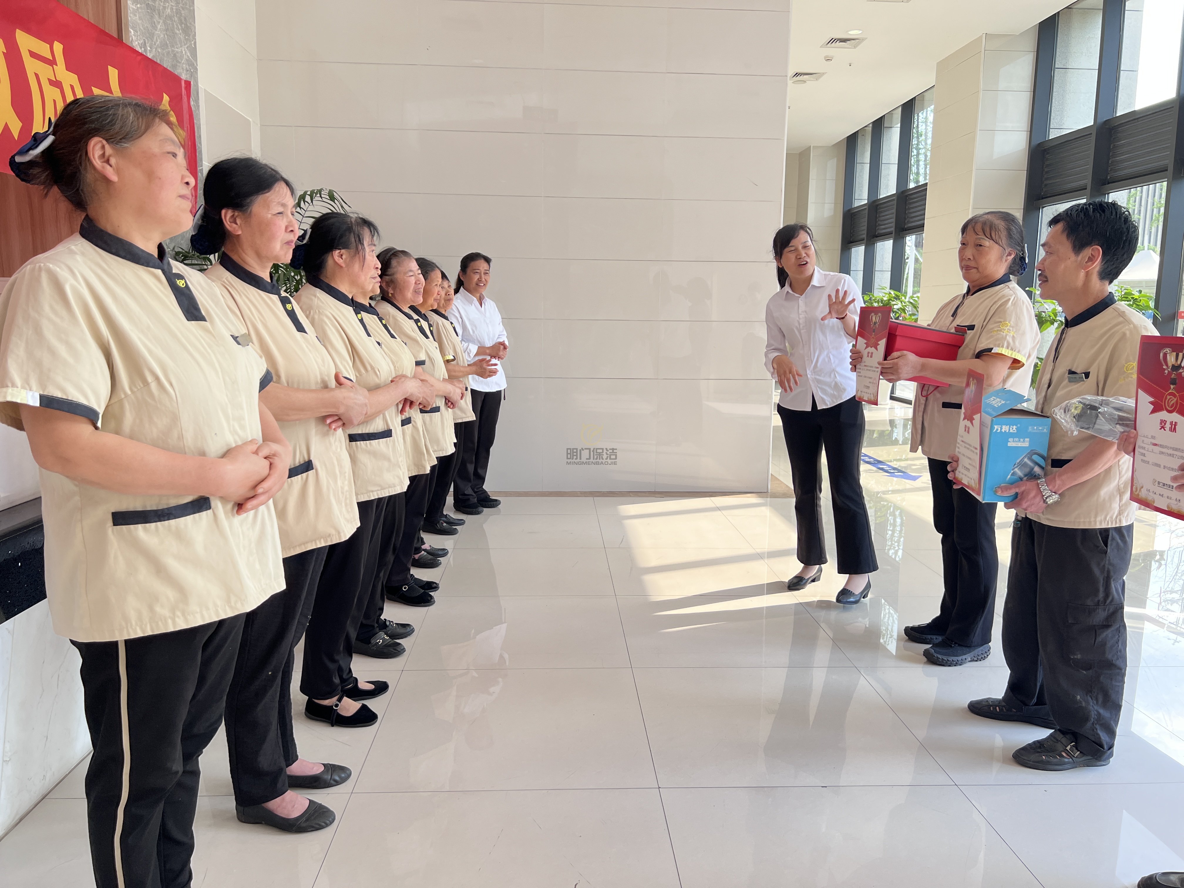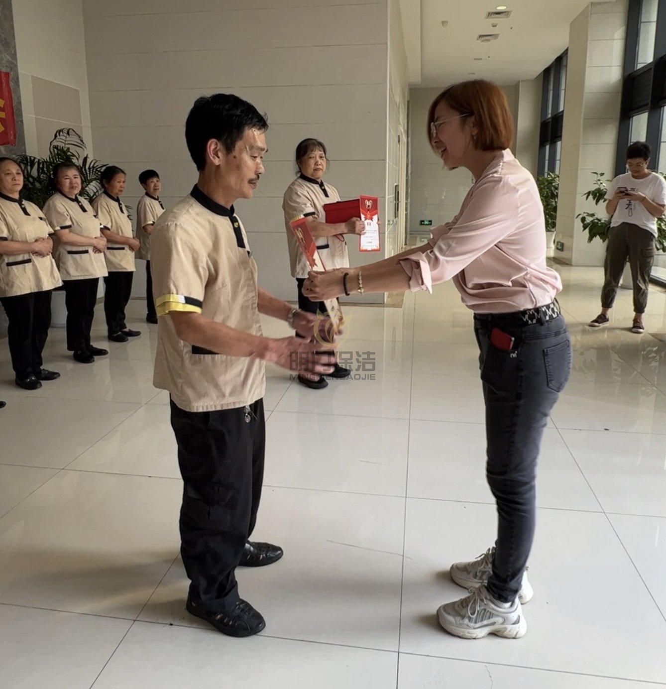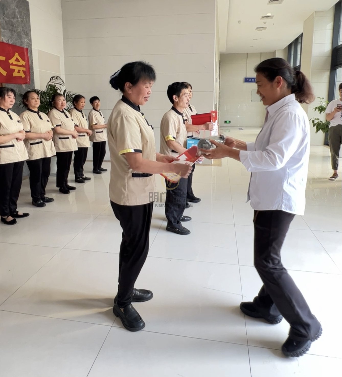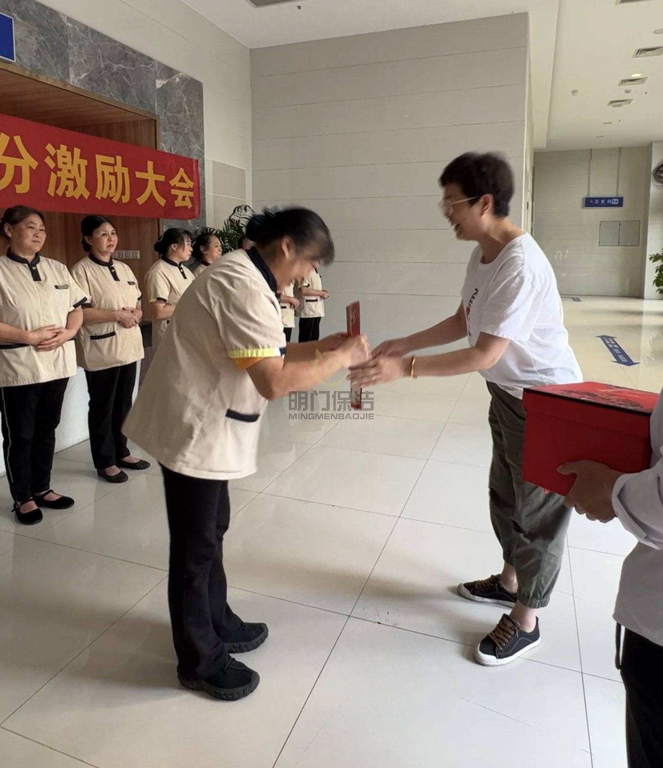 保洁阿姨们整齐着装,集合完毕,做好会前准备,等待会议开始 。我们的工作场地,每一个干净整洁的角落,都离不开我们辛勤、负责的保洁员工。
