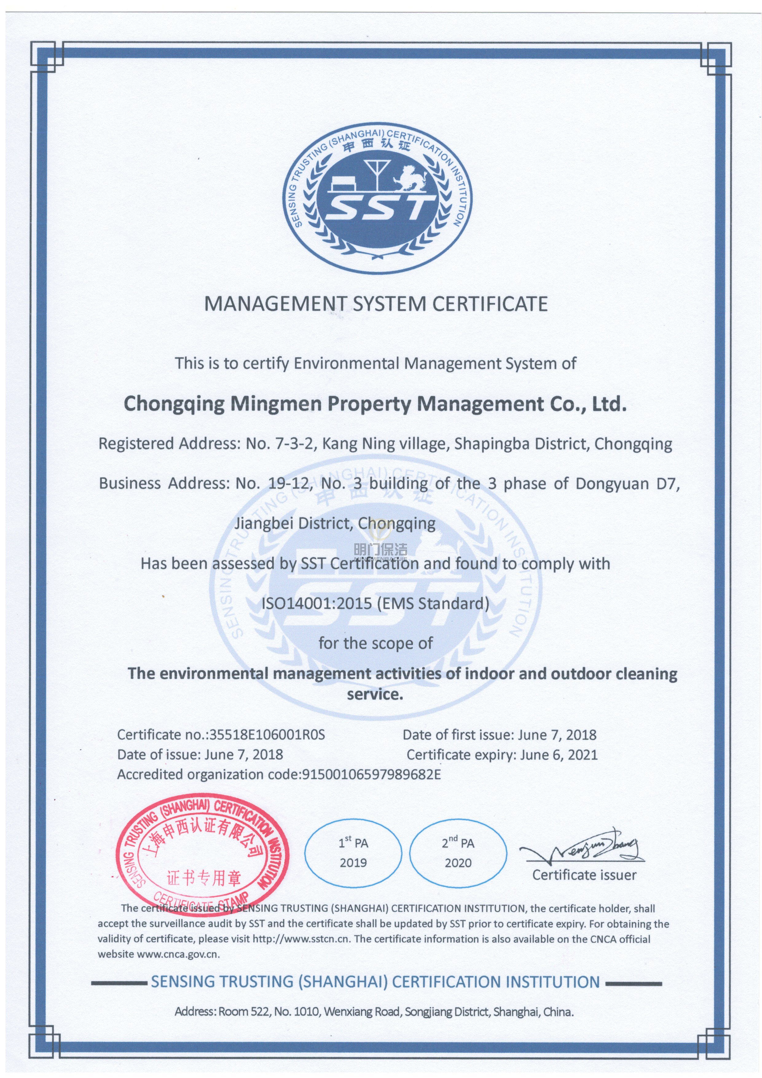 环境管理体系认证证书--英文版